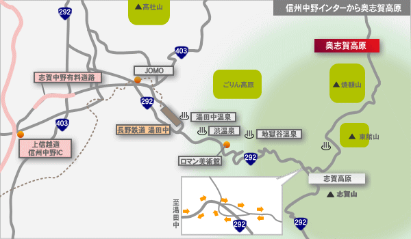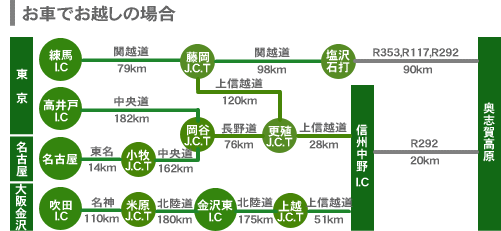・関越自動車道渋川ICより草津、白根火山を経て志賀高原(冬期は閉鎖)